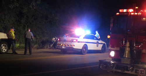 West Kittanning Fire Chief Bernie Bowser, Sr. and Pennsylvania State Police troopers look over the scene of a motorcycle accident yesterday along Butler Road.