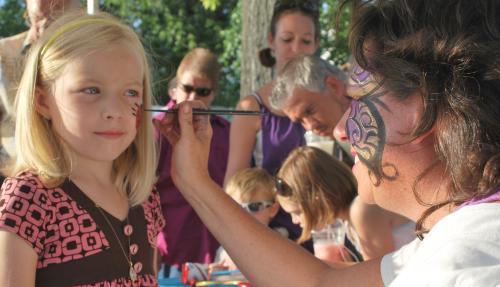 Pittsburgh artist Dawn Gurtner (right) applies hand-painted tattoos to six-year-old Josie Grossbauer of Rayburn Township during opening night of the Fort Armstrong Folk Festival. Gurtner historically specialized in portrait and mural painting until about six years ago. “I had an opportunity to do face painting at stores, museums, and then realized I could do it at festivals,” she said. She customizes each tattoo to correspond with the bone structure of each face.