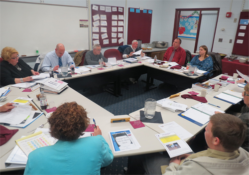 During a budget committee planning session before the regular meeting, a majority of committee members reviewed individual expenditures expected in the 2014-15 school year budget.
