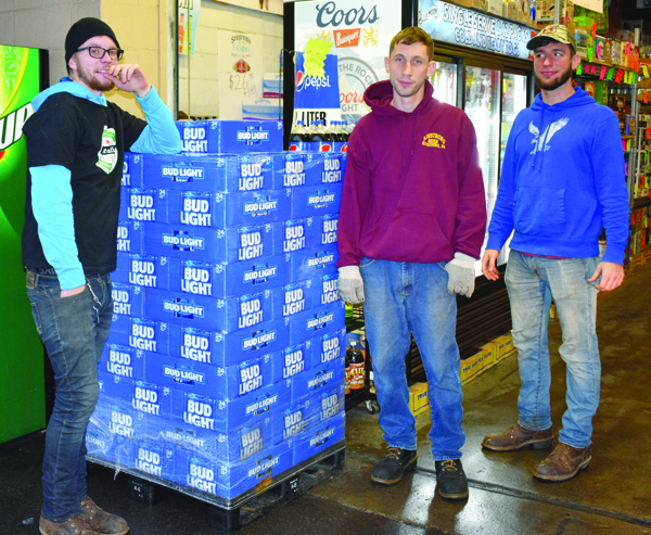 Workers at Armstrong Beer Distributing in Kittanning take a brief moment for a picture. Sales of alcoholic beverages throughout the area have been climbing in preparation for the holiday and deer season. The employees pictured left-to-right are: Tyler Fair, Dustin Scopel, and Nick Huth.