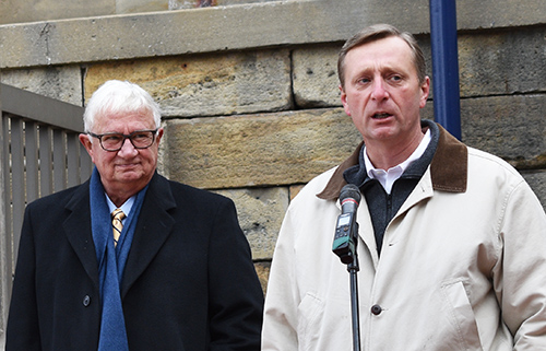 State Representative Jeff Pyle (right) addresses the crowd at the Downtown Kittanning Revitalization Dedication on December 5, 2018 as State Senator Don White looks on.