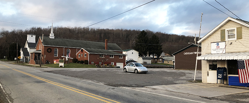 Until about 1953, Cadogan had a movie theater that sat on this vacant lot next to the Cadogan Township Building (then a union hall).