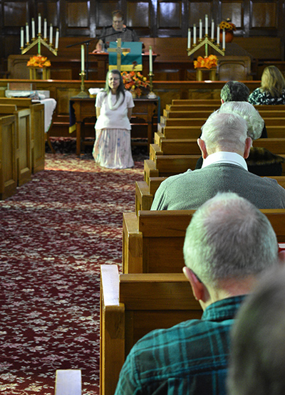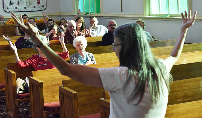 East Brady United Methodist Church former minister Lola Turnbull leads congregation in a worship song during its 150th Anniversary service last Saturday, October 5, 2019.