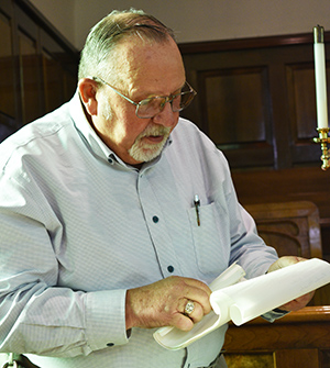 Member Jim Corbett reads the names of past members from handwritten scrolls during Saturday’s anniversary celebration of East Brady UMC.