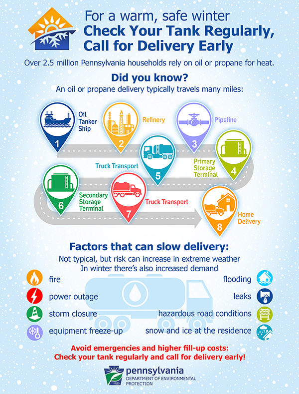 “Many people don’t realize the route a heating oil or propane delivery takes to reach their residence. They may wait until there’s just a few days’ supply or less left before calling to schedule a delivery,” said DEP Secretary Patrick McDonnell. “A winter storm isn’t a good time to discover the tank is empty or the generator is out of service. To be safe this winter, we encourage people to check their tank regularly and call for delivery early.”